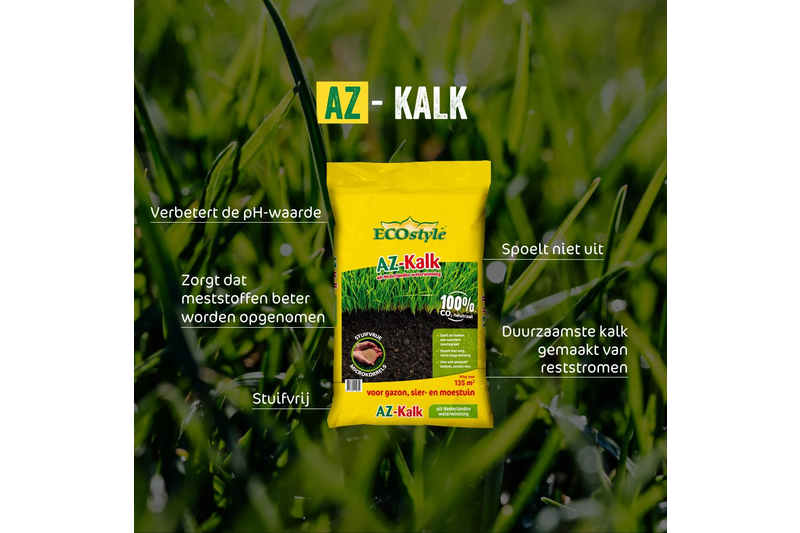 ECOstyle AZ Kalk is een duurzame en natuurlijke bodemverbeteraar die de zuurtegraad (pH-waarde) van tuingrond effectief en gecontroleerd corrigeert. Deze innovatieve kalkkorrel is vervaardigd als CO₂-neutraal restproduct uit Nederlandse waterwinning, waardoor er geen kalkgroeves of waardevolle natuurgebieden worden aangetast. Door de unieke samenstelling bindt AZ Kalk direct met zuur in de bodem en geeft het alleen de juiste hoeveelheid kalk af — precies wanneer de bodem het nodig heeft.