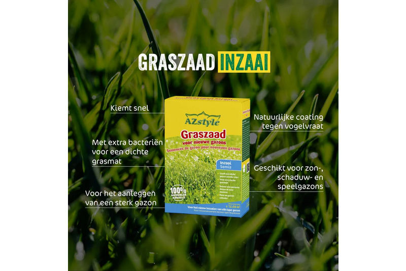 Houd de ingezaaide grond gedurende de eerste 2–3 weken constant licht vochtig. Laat het gras pas betreden wanneer het voldoende geworteld en minimaal 8–10 cm hoog is.