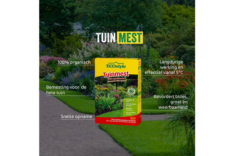 ECOstyle Tuinmest is een organische, universele meststof voor de complete tuin. Deze uitgebalanceerde voeding voorziet planten, struiken en bomen van essentiële voedingsstoffen voor een gezonde groei, sterke wortelontwikkeling en een rijke bloei.
